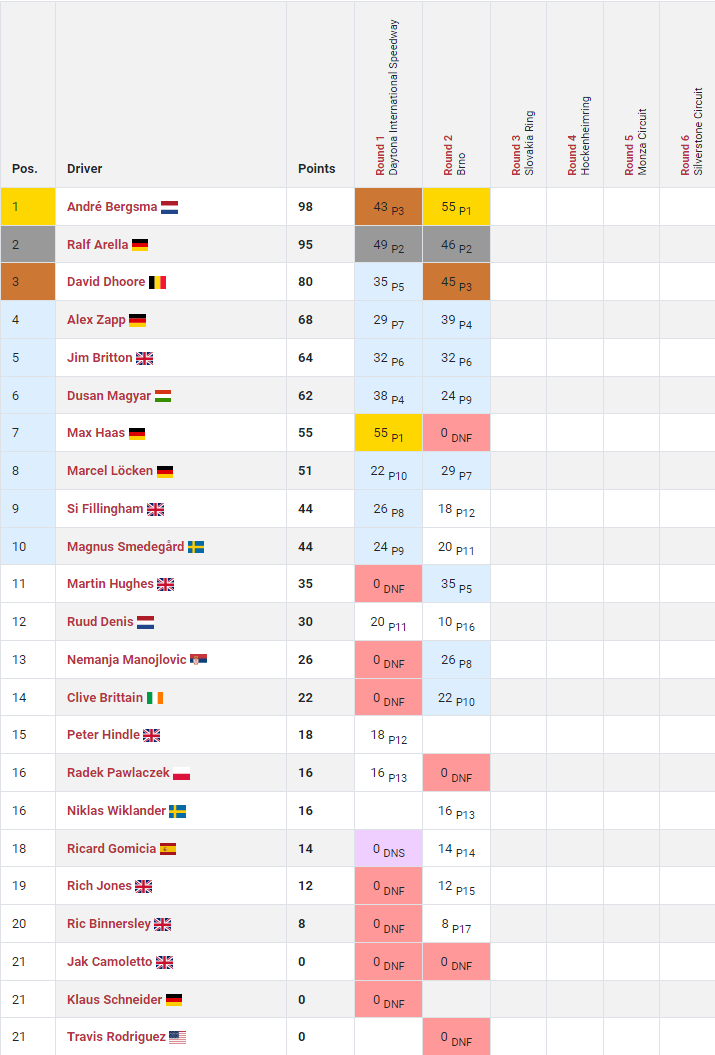 Already, by the end of lap one, the Nissan of Haas had blasted past Bergsma and Schneider on the banking to take the lead, with Arella hot on his heels. Apart from Fillingham, early casualties included Binnersley who failed to get his mustang slowed in time for the bus-stop chicane and went straight through the run-off area to earn himself a drive-thru penalty, Hughes who had jammed his engine map into qualifying mode and found the full tank of fuel acting as a counterweight as the car over-rotated first at T1 on lap 2, then at the bus-stop later in the lap in a more extreme fashion, effectively destroying the engine. Unfortunately, the front-running Schneider would suffer from the same problem, and result, a few laps later. Other DNFs would include Camoletto, also at the bus-stop, front-running Mustang driver Manojlovic, Clive Brittain, Rich Jones, Ric Binnersley and Ricard Gomicia.