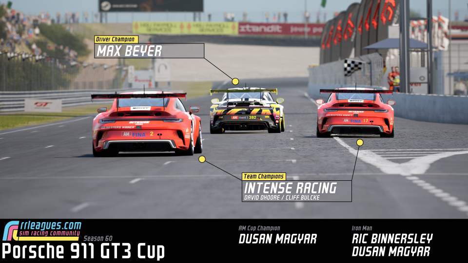Season 60 saw us compete in the brutal Porsche 911 GT3 Cup (model 922) car. It resulted in a fierce battle for the championship, which a new member of our community won.